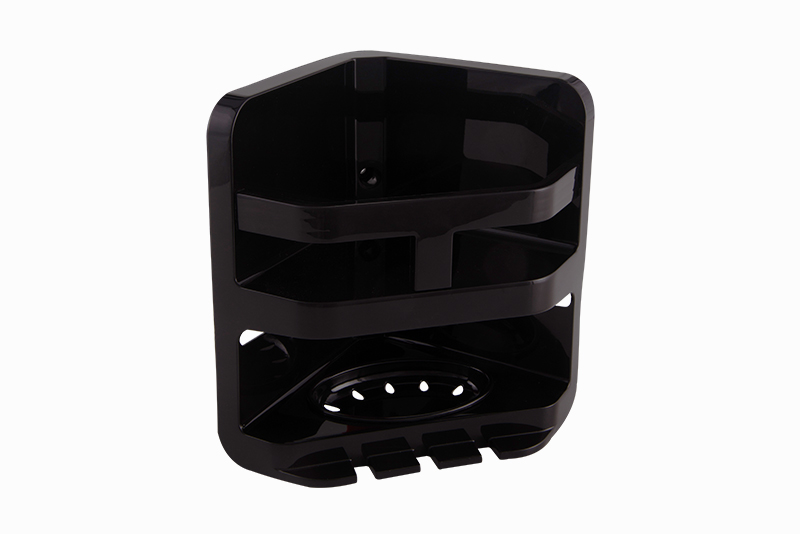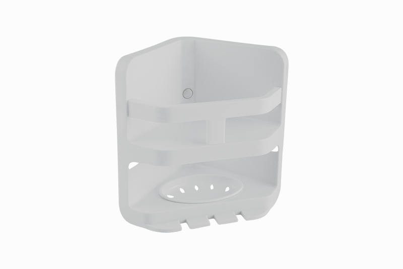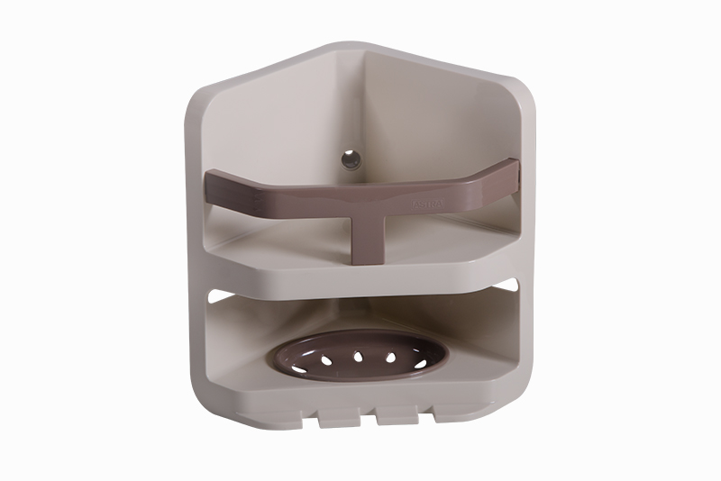 Cantoneira plástica com uma saboneteira, mais um compartimento para organizar produtos de higiene pessoal ou limpeza, além de ganchos para apoiar a lâmina de barbear ou pendurar pequenos objetos.