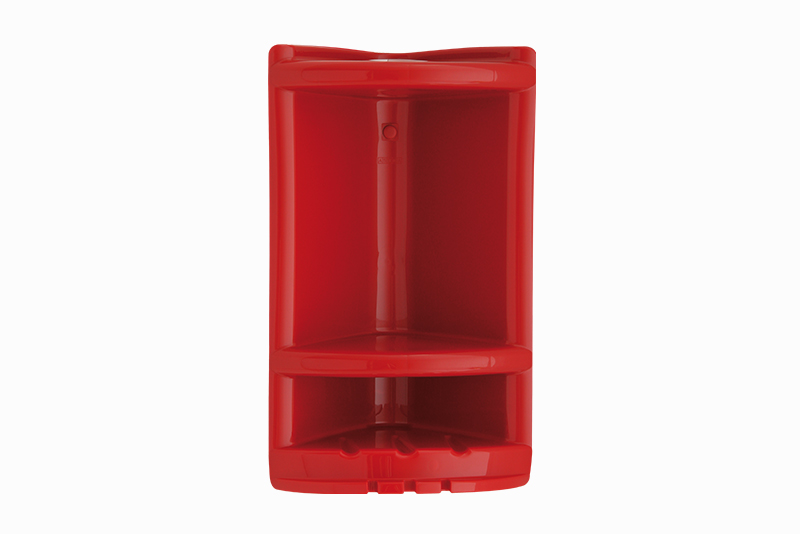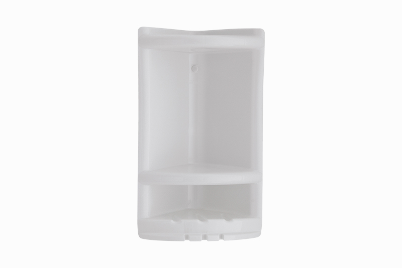 Cantoneira Plástica com saboneteira, ganchos e dois compartimentos para organizar produtos de higiene pessoal ou de limpeza.