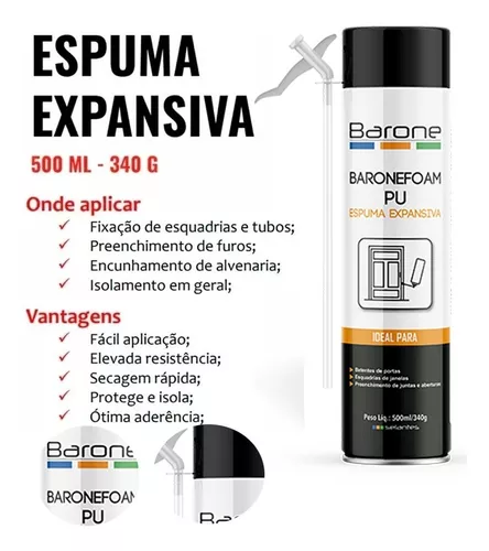 Espuma expansiva de poliuretano, monocomponente, que reage com a umidade do ar tornando-se, após a cura, em uma espuma rígida, atóxica e com propriedades de fixação, adesão, isolamento e enchimento.