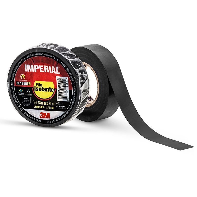 A fita isolante 3M imperial é indicada para uso geral e doméstico. É ideal para pequenos reparos elétricos, reforço em cabos de ferramenta e manutenções provisórias. Possui boa isolação térmica e flexibilidade, é resistente a raios ultravioletas e reduz a vulnerabilidade dos materiais. É fácil de aplicar e de rasgar, garantindo bons resultados e conformabilidade. Esta fita imperial não contém metais pesados, é retardante a chama e fabricada no Brasil. Sua classe de tensão é de 750 V, e a classe de temperatura é 90°C. Ela é constituída por um dorso vinilíco recoberto, com uma camada de adesivo à base de borracha sensível à pressão. Para utilizar o produto no isolamento de materiais, aplique quatro camadas da fita sempre alongada 50% e em meia sobreposição em cada volta. Termine com sobreposição 100% sobre a própria fita. Modo de aplicar: para isolamento, aplique quatro camadas da fita sempre alongada 50% e em meia sobreposição em cada volta. Termine a aplicação com sobreposição 100% sobre a própria fita.