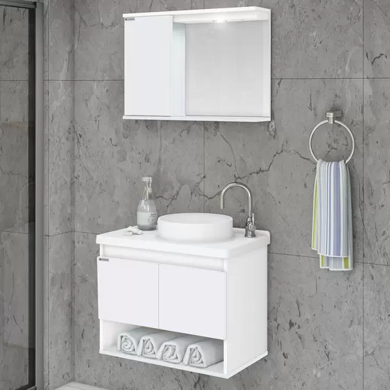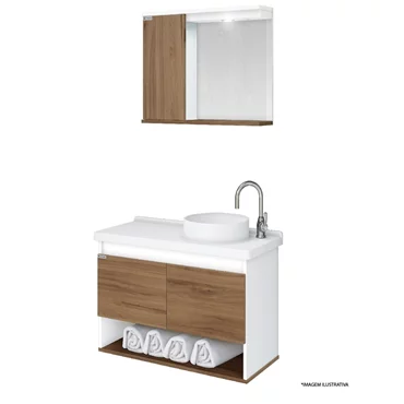 Modelo: Suspenso Material: MDP Material da prateleira: Vidro Material da pia: Mármore sintético Espessura: 12 mm Acabamento: Madeirado Escala de brilho: Semi brilho Quantidade de portas: 2 Iluminação: Sim Prateleira interna: Sim Voltagem da luminária: Bivolt Tipo de iluminação: Led Tipo de porta: Abrir Tipo de puxador: Perfil Tipo de dobradiças: Hidráulica Área indicada de uso: Banheiros, lavabos, área de lazer Necessita montagem: Sim Necessita fixação na parede: Sim