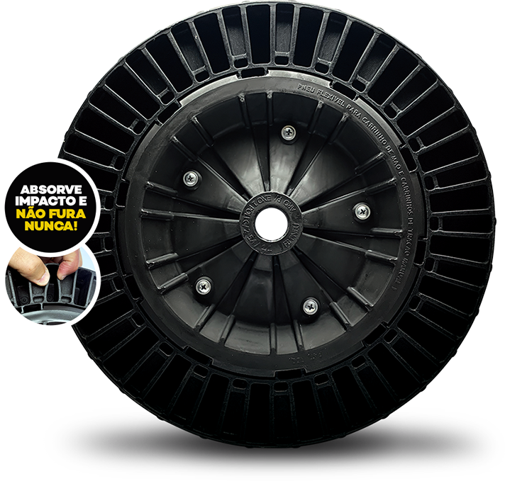 Solucionando demandas de mercado, elaboramos uma nova fornulação para um pneu de 335mm com aro de polipropileno. Um produto de alta qualidade, com especificações técnicas ideais para transporte de peso.